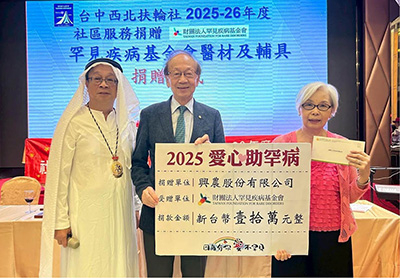 基金會創辦人陳莉茵女士致詞表示,貴社與基金會的善緣已延續十年之久,幫助無數病友改善生活、減輕照護壓力,也讓罕病家庭在黑暗中看見一絲光亮,這不只是一次次的捐贈,而是十年如一日的陪伴與支持,她動情地說道,感謝台中西北社持續用行動詮釋社會責任。