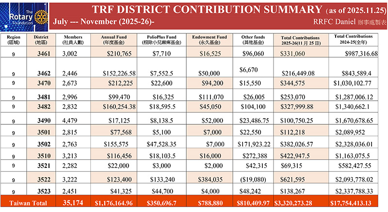 2025年11月份Zone 9 各地區累計捐獻月報表