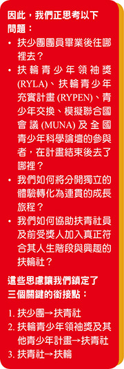 2. 繪製地區內的青年發展路徑圖:檢視目前運作的計畫與社團 —— 扶少團、扶輪青少年充實計畫、模擬聯合國、青少年交換、扶輪青少年領袖獎、扶青社、扶輪社,及網路社。自問:這些組織如何串連?缺口在哪裡?誰在支持年輕人從一個階段邁向下一階段?