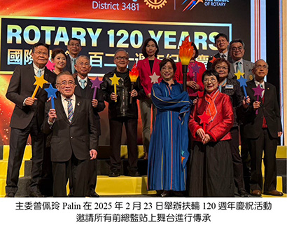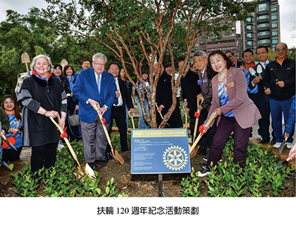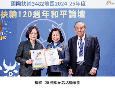 我們有幸為國際扶輪創立120週年的一員,3482地區以「和平、永續」作為慶祝的主軸。12月初喜迎國際扶輪社長RIP Stephanie A. Urchick來台之際,邀請社長和前社長PRIP Gary、理事RID Naomi一同豎立了象徵和平的紀念柱。同時在元月初藉著扶輪基金會主席Trustee Chair Mark Maloney訪台之際,邀請主席和Trustee Frank共同進行「植樹計畫」。並在國際扶輪120週年創立日的前一天2月22日邀請蔡英文前總統、外交部林佳龍部長、政治外交專家李明峻博士舉辦和平論壇,廣邀國際領導人與社會賢達,共同為世界和平發聲。這不僅是一場知識與理念的交流,更是對扶輪宗旨「增進國際間之瞭解,親善與和平」的真實實踐。