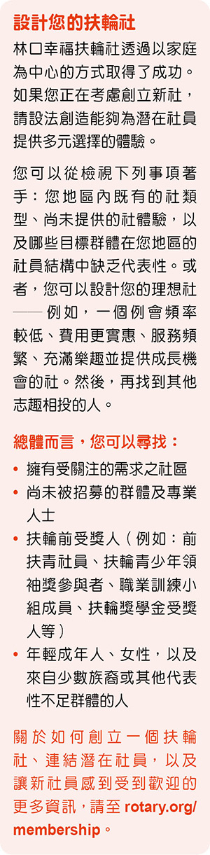 將「幸福」放入扶輪社名稱是設定議程的一種方式。「從一開始,我們的使命就很明確:我們推動的每一項活動都必須對受益人的情感健康做出有意義的貢獻。」赫爾維蒂亞幸福(Helvetia Happiness)扶輪社前社長沙姆‧V.D.穆杜(Syam V.D. Mudhoo)說道。該社甚至設立了一位「幸福總監」,負責推動各種活力。這位負責人負責監督「正念時刻」和「自發性大笑瑜珈」等活動。每月一次、面向公眾開放的「週五歡樂聚會」打破了傳統的會議形式,透過遊戲和初見面活動,「為大家帶來驚喜、愉悅和活力,」穆杜說。「我們也知道,真正的影響力始於內心。」因此,成員們努力保持良好的精神狀態。「這是生命線。」
