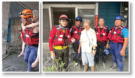 (Iver、A-HUI、Roy、Wilson),投入第一線。那是極為艱難的任務:泥漿覆蓋、道路中斷,沒有出入口、沒有通道,但災民就在裡面。志工們只能徒步涉泥,攀爬節梯將災民細心呵護的引導至路面,然後,再協力揹著災民至收容處所,又轉身投入下一個搜救。就這樣,他們8位在光復奮戰兩天兩夜。