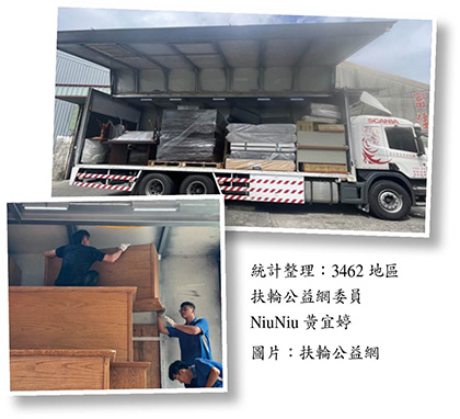 求資訊後,號召社友Clean王文章熱心捐贈138張書桌、Jugs陳明仁捐贈7張單人床,另外,台中國美社Jerry張榮杰捐贈11張辦公桌、彰化松柏社Mamini楊勝媚捐贈1張雙人床墊。3461 地區公益網執行長台中惠中社Material王俊源第一時間完成媒合,並於10月9日派車前往中興新村載運物資,送往花蓮光復村。