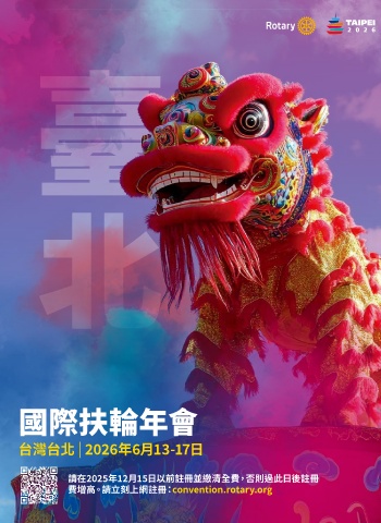 國際扶輪年會 台灣台北 | 2026年6月13-17日 請在2025年12月15日以前註冊並繳清全費,否則過此日後註冊 費增高。請立刻上網註冊:convention.rotary.org 臺灣扶輪 2025.8 15