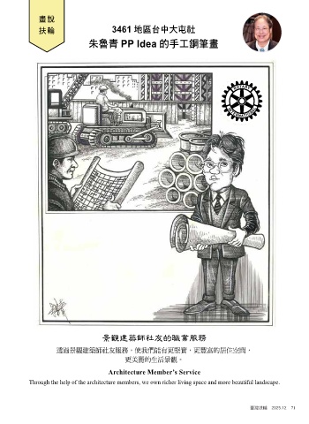3461 ήਜ̨ʕɽˊٟ ϡኁڡ PP Idea ٙ˓ʈ፻അ 景觀建築師社友的職業服務 ீཀ౻ᝈܔጘࢪٟʾਕdԴҢࡁঐϞһྼdһᔮబ֢ٙИ٤ගd һߕᘆٙ͛ݺ౻ᝈf Architecture Member’s Service Through the help of the architecture members, we own richer living space and more beautiful landscape. 臺灣扶輪 2025.12 71