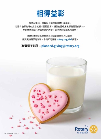 相得益彰 餅乾配牛奶,扶輪配上捐贈者建議計畫基金, 世間有些事物唯有成雙成對才更顯圓滿。讓您在獲得歲末節稅優惠的同時, 亦能精準資助心中最在意的志業,其他便由扶輪為您效勞。 邀請您體驗全新的捐贈者建議計畫基金入口網站, 感受更加甜美的滋味。今日即可前往 rotary.org/daf 探索。 聯繫電子郵件:planned.giving@rotary.org 44 臺灣扶輪 2026.4
