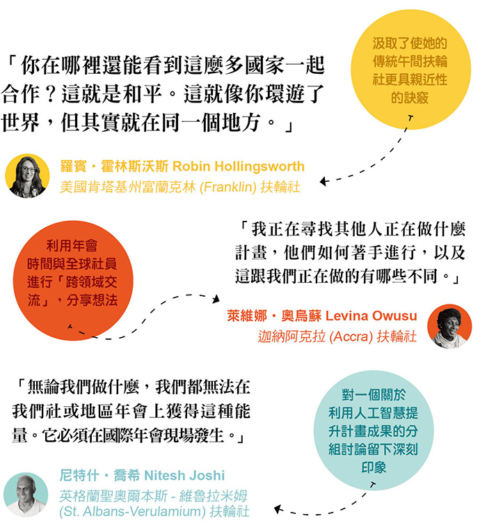 當你詢問扶輪社員為何參加國際扶輪年會時,他們總是情不自禁地微笑。他們被傑出演說者的發言所鼓舞,從學習課程中獲得源源不絕的構想,而當握手轉變為友誼
