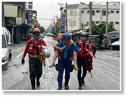 (Iver、A-HUI、Roy、Wilson),投入第一線。那是極為艱難的任務:泥漿覆蓋、道路中斷,沒有出入口、沒有通道,但災民就在裡面。志工們只能徒步涉泥,攀爬節梯將災民細心呵護的引導至路面,然後,再協力揹著災民至收容處所,又轉身投入下一個搜救。就這樣,他們8位在光復奮戰兩天兩夜。