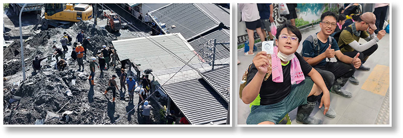 在假日結束的隔天(9月30日至10月1日),他們在凌晨4時出發,駕車直奔花蓮災區,只為在第一時間為受災居民伸出援手。抵達現場後,兩人與當地志工及宜蘭扶輪社友共同投入救災行列,手握鐵鏟、搬運泥塊、疏通水溝,協助居民清理被厚重泥濘淹沒的家園。