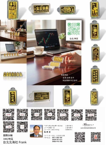 營業項目 金塊 金條 金卡 純金獎牌 帝王金印 中華民國金銀珠寶同業協會 名譽理事長 台北市銀樓公會 名譽理事長 台北市龍山林姓宗親會 名譽理事長 林材源 國際扶輪 台北市金山南路一段110巷12號 行動電話: 0977-288-789 3482地區 0928-307-672 0928-307-672 台北北海社 Frank 0966-445-768 台北北海 Frank