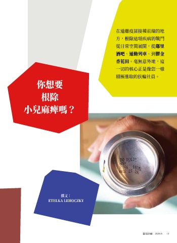 在遠離疫苗接種前線的地 方,根除這項疾病的戰鬥 從日常空間展開,從鄰里 酒吧、通勤列車、到鬱金 香花田。毫無意外地,這 一切的核心正是像您一樣 積極進取的扶輪社員。 你想要 根除 小兒麻痺嗎? 撰文: ETELKA LEHOCZKY 臺灣扶輪 2026.5 13 may26-D-PolioFundraising.indd 29 3/24/26 01:22